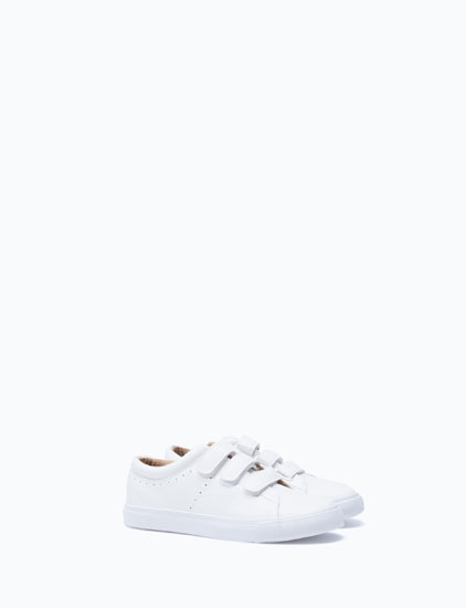 Estas sapatilhas são super fashion. São brancas, logo podemos usá-las com quase todas as peças de roupa. E funciounam com fecho aderente por isso são faceis de calçar.
