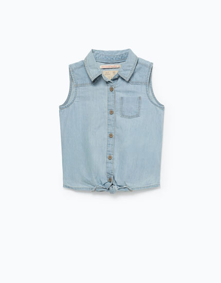 É muito bonita esta camisa de ganga, não acham. Não tem mangas compridas e tem um nó na parte de baixo. Pode ser usado com estas peças aqui ao lado. E é ideal para a primavera e o verão, ou para ir comer um gelado e passear no parque.